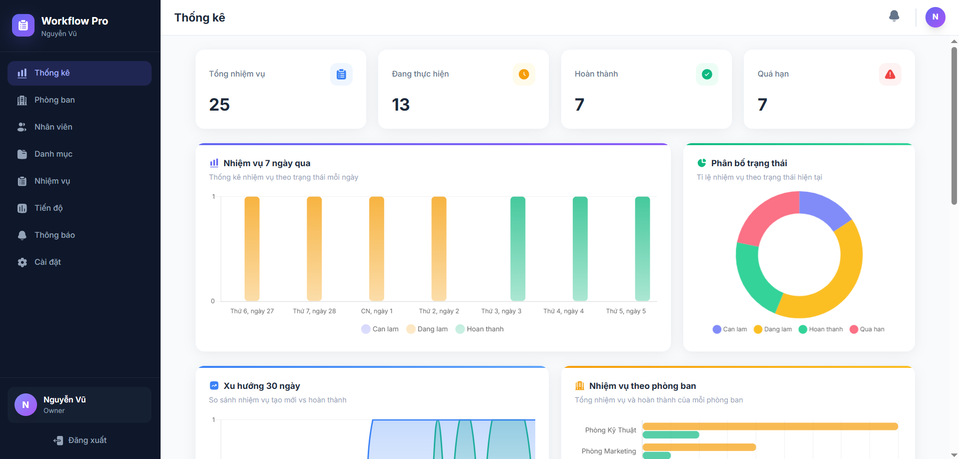 • Dashboard trực quan: Thống kê tổng nhiệm vụ, đang thực hiện, hoàn thành, quá hạn theo thời gian thực — kèm 6 biểu đồ Chart.js chuyên sâu.