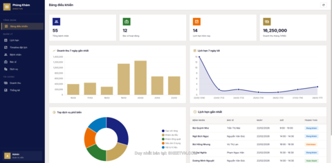 - Dashboard trực quan: Thống kê tổng bệnh nhân, bác sĩ hoạt động, lịch hẹn hôm nay, doanh thu tháng theo thời gian thực, biểu đồ doanh thu 7 ngày gần nhất, lịch hẹn 7 ngày tới, top dịch vụ phổ biến và bảng lịch hẹn gần nhất.