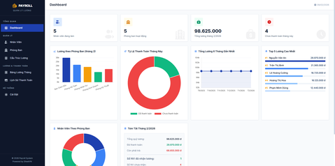 - ✔️ Dashboard trực quan: Tổng quan về số lượng nhân viên, tổng lương tháng, trạng thái thanh toán, biểu đồ lương theo phòng ban và xu hướng 6 tháng.