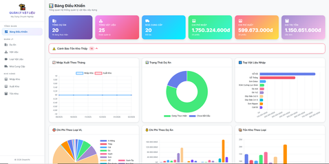 - Quản lý kho vật liệu hiệu quả: Theo dõi số lượng, đơn vị tính, giá cả và tồn kho tối thiểu của từng loại vật liệu.
