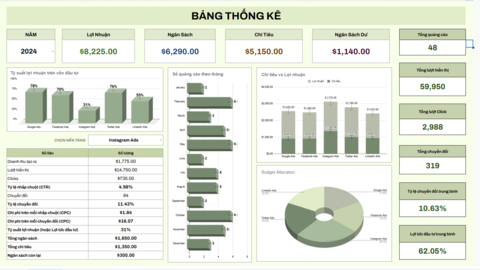 Sheet quản lý chi phí quảng cáo đa nền tảngBiểu đồ phân tích chi phí quảng cáoGiao diện sheet quản lý chi phí quảng cáoBảng thống kê hiệu suất quảng cáo